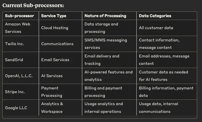 1stContact.ai will update this list as Sub-processors are added, removed, or changed. Customers will be notified of material changes to Sub-processor arrangements.